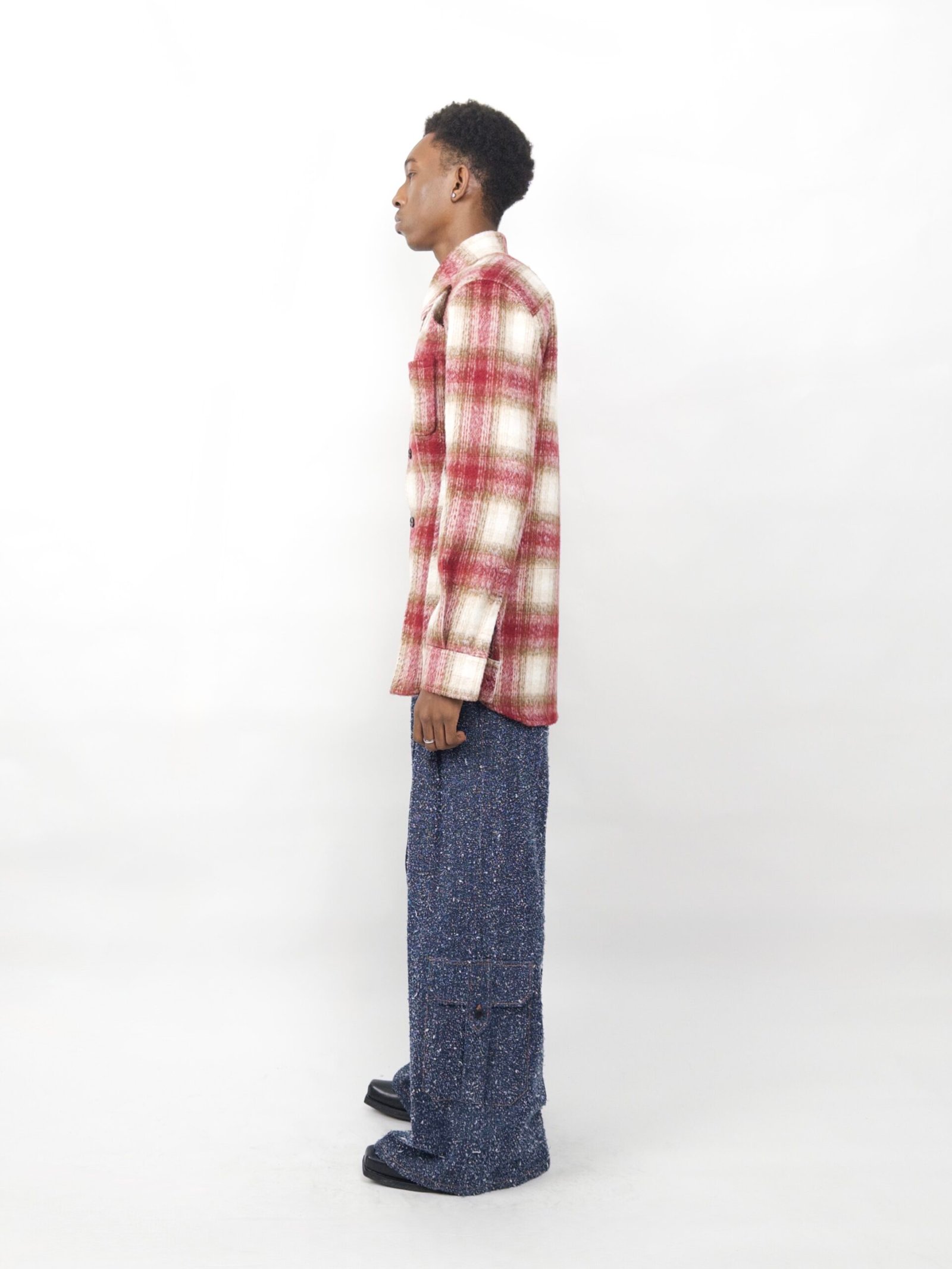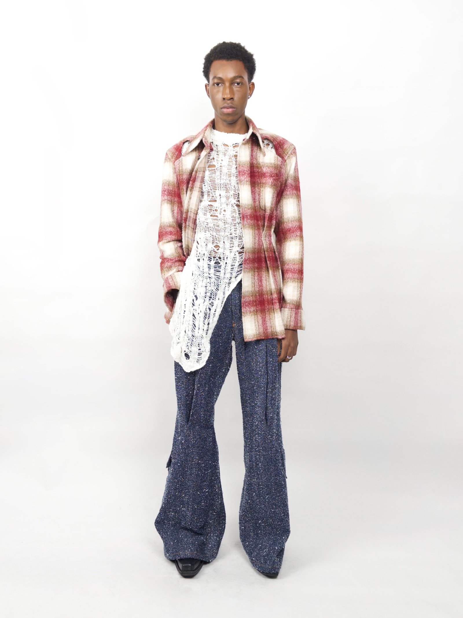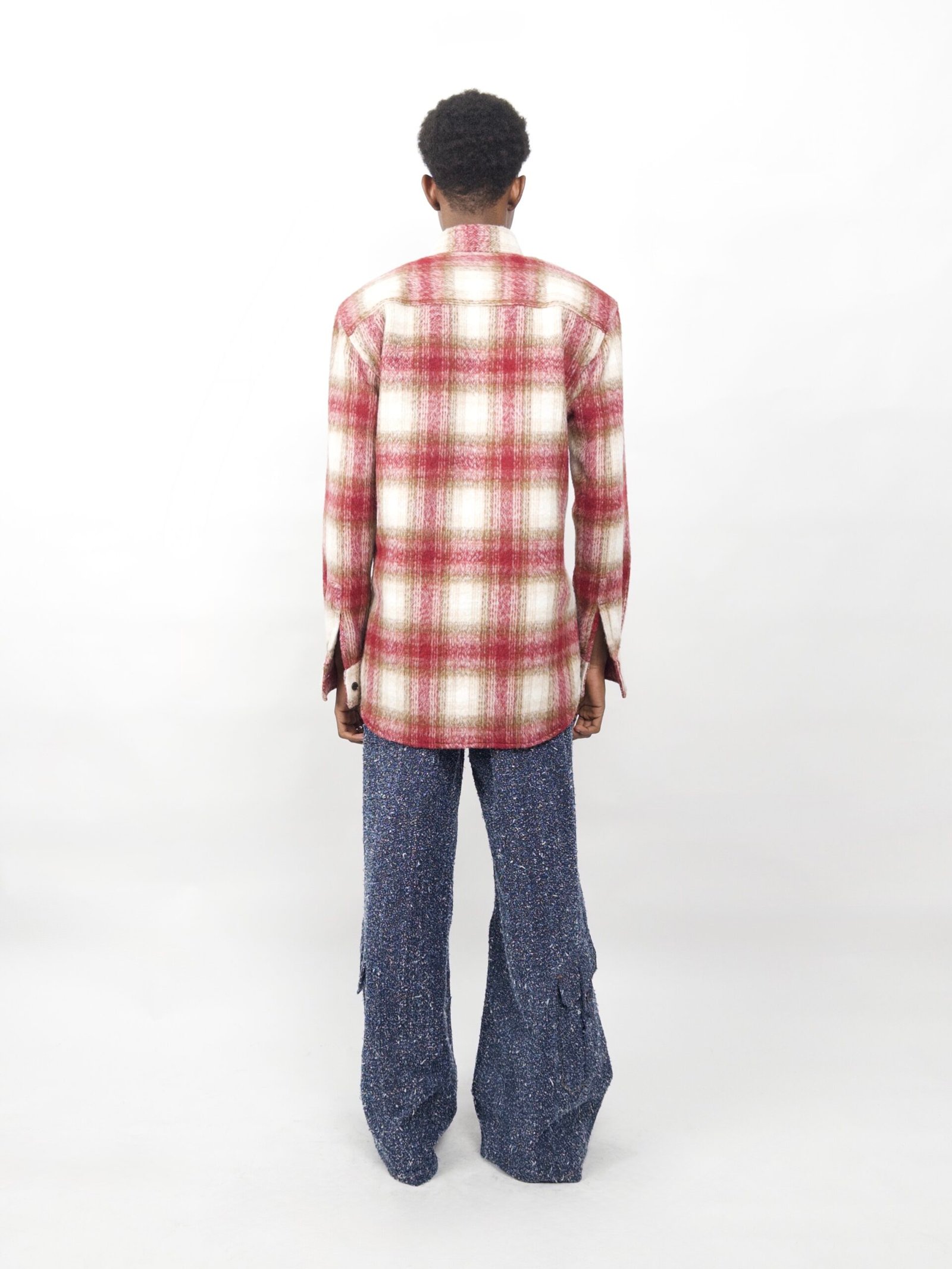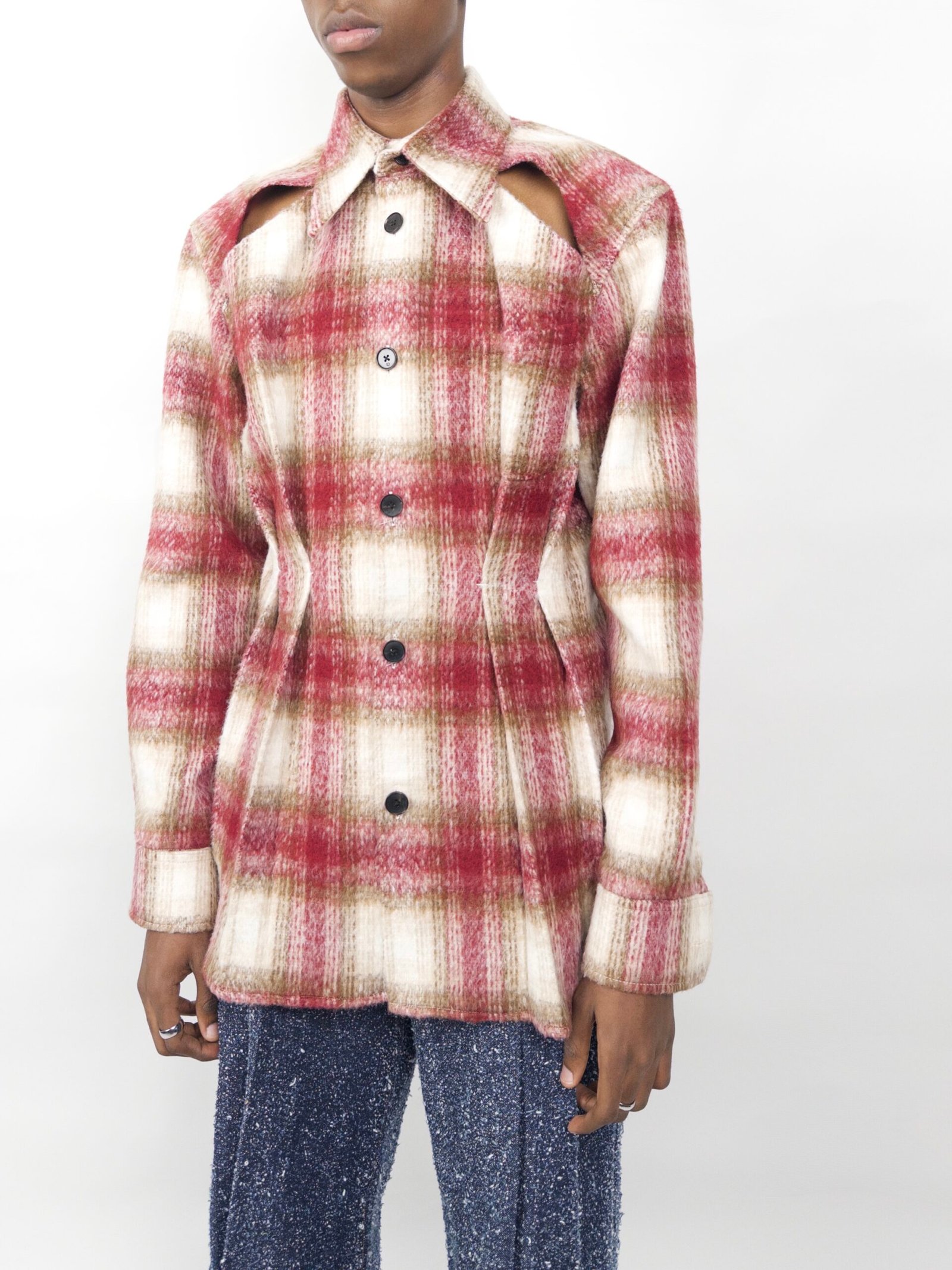 A sculptural shirt-jacket crafted in brushed mohair with a soft plaid pattern. Front pleats subtly sculpt the waist, while open shoulder cut-outs and a tailored silhouette give it a modern, architectural edge.
