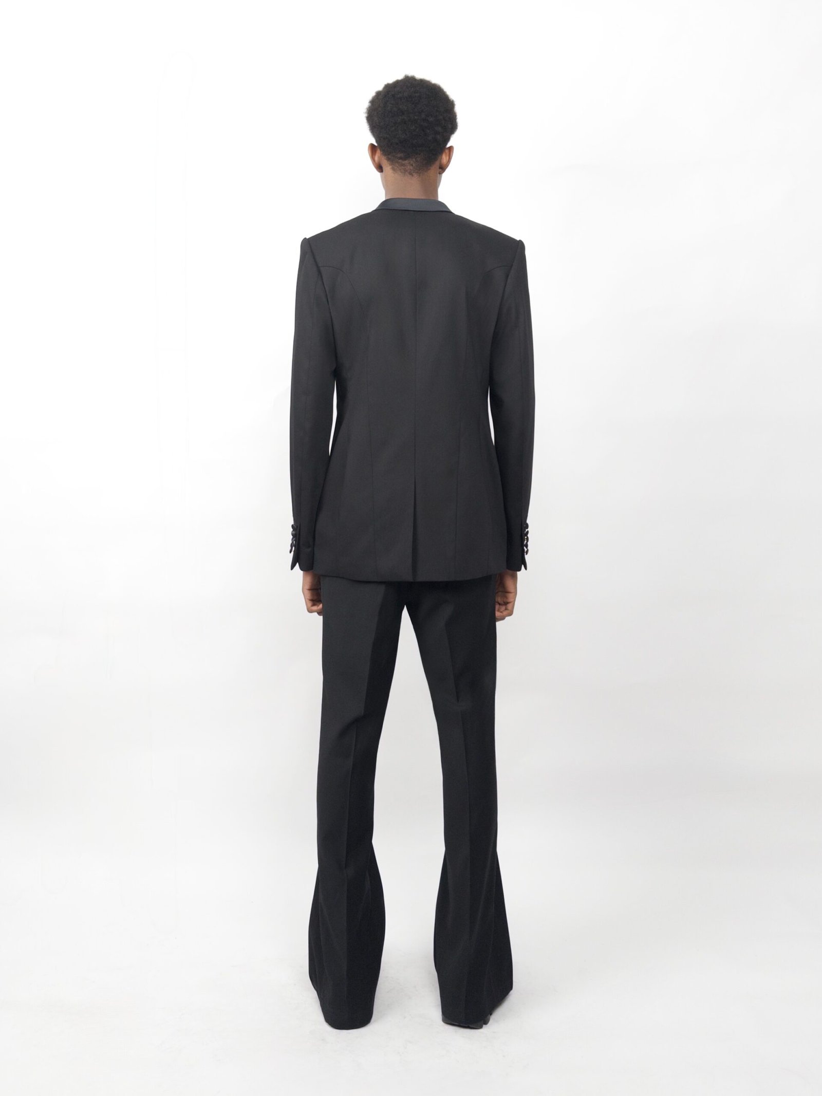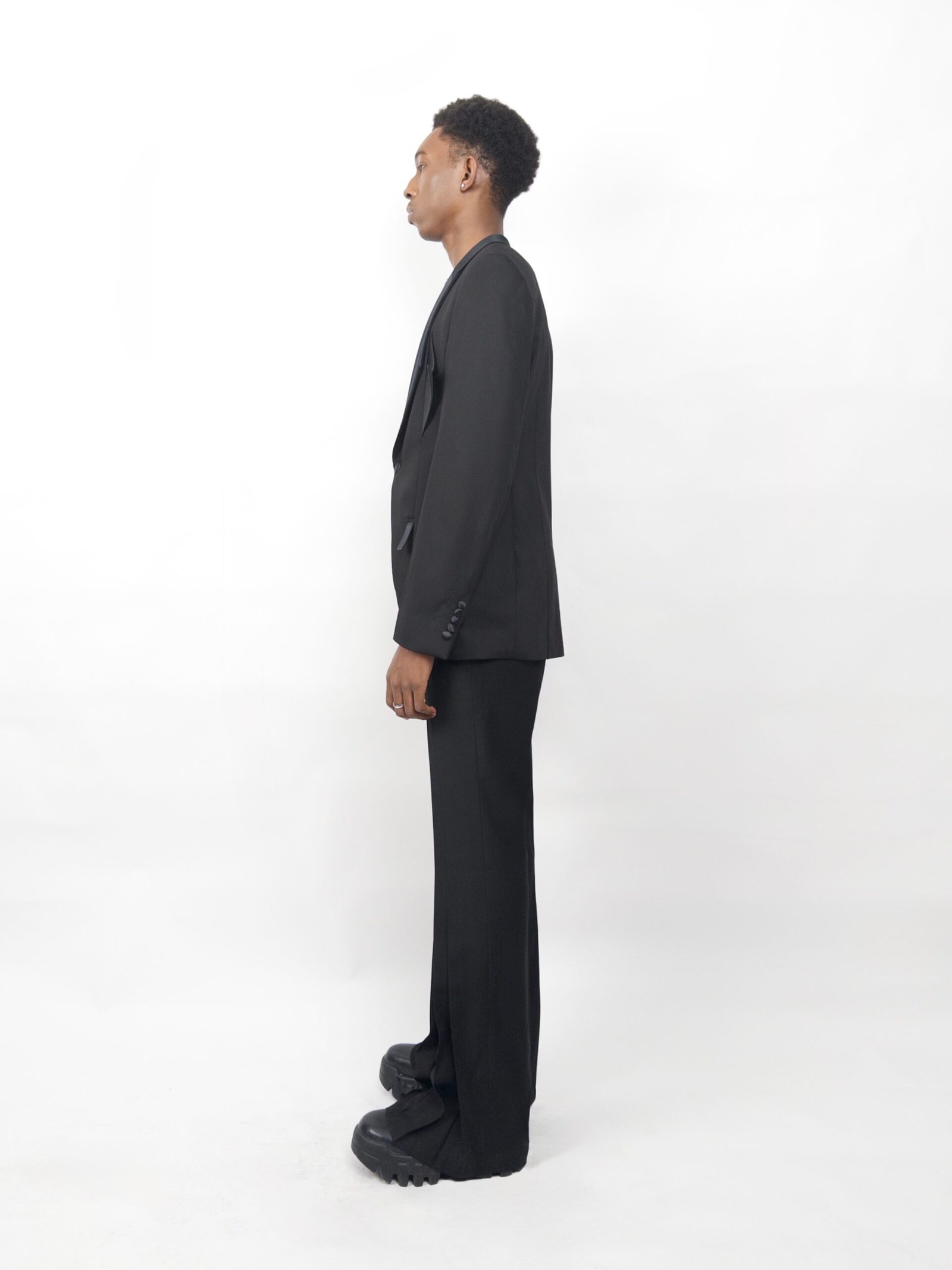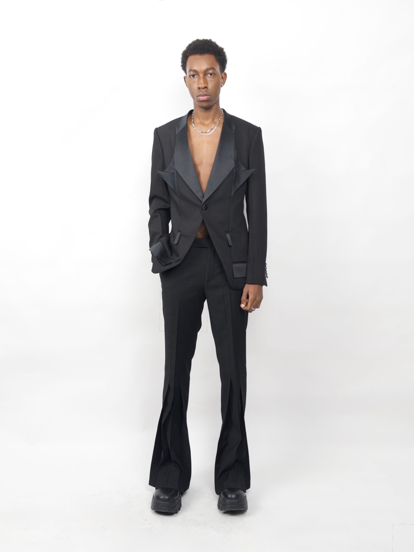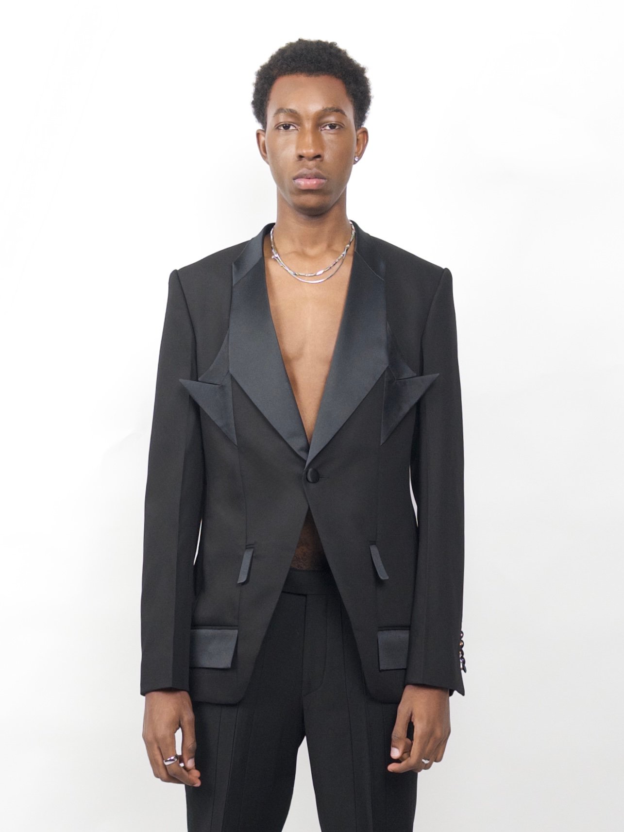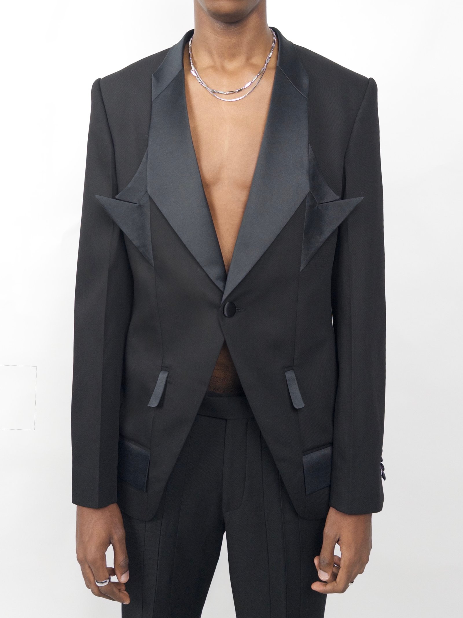 A tailored black blazer with sharp split lapels and matching split pockets. Satin contrasts and precise lines give the classic tuxedo silhouette a futuristic, architectural edge.
