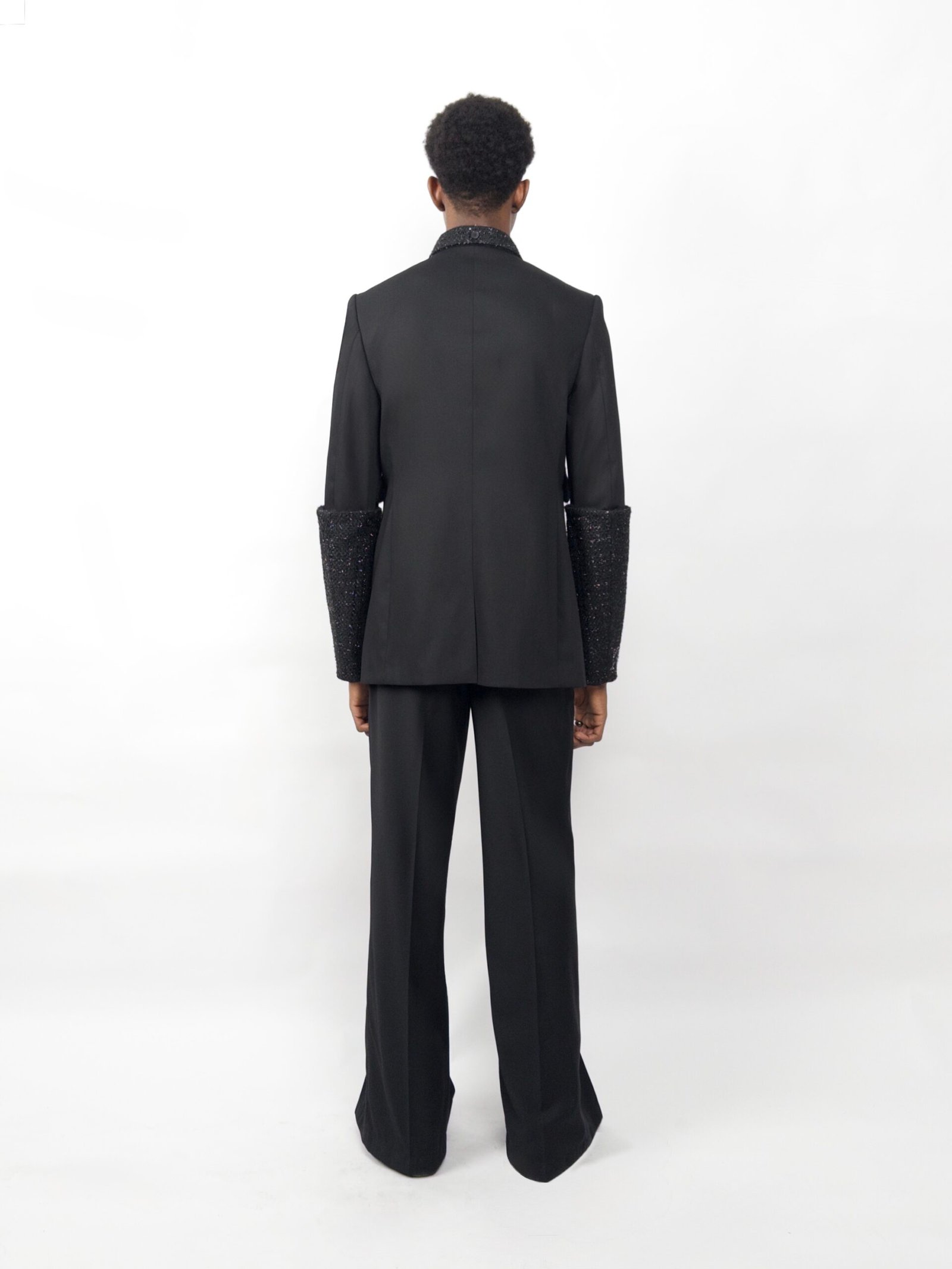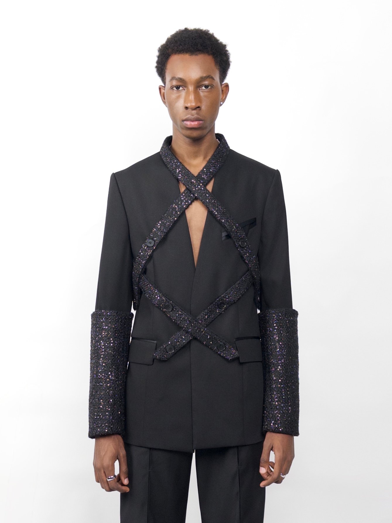 The Eclipse Blazer features double-sided straps and sleeves for versatile styling, while six buttons create the illusion of a double-breasted jacket on a single-breast structure — a subtle play on deception and deconstruction.