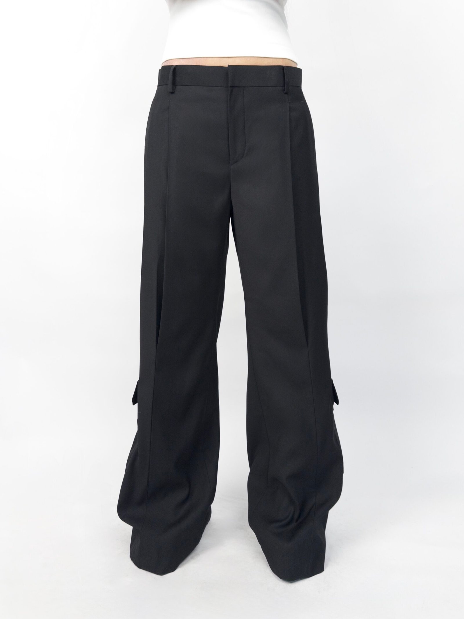 Nothing is as simple as it seems. These wide-leg trousers feature a stitched crease that runs from the hem up to the knee, creating a distinctive flow and movement. A patch pocket with a flap sits discreetly at the bottom, while the back pocket showcases the SS26 signature cutout mechanism that doubles as a fastening element — blending form and function with subtle complexity.